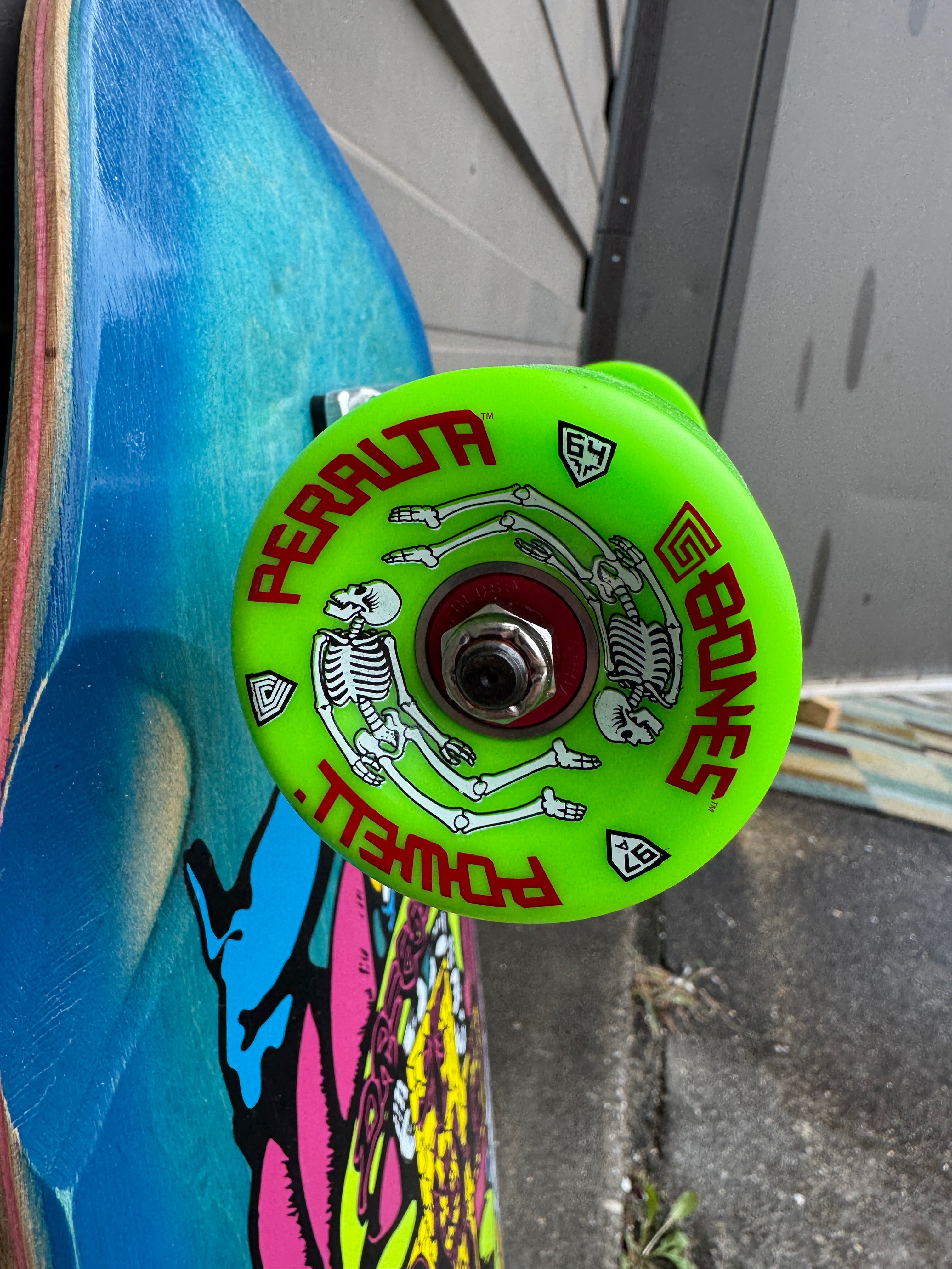 THIS BOARD- This is the Dog Town classic model in blue/teal colorway. The deck is 31” x 10” and has the classic Dog Town graphic on the teal woodgrain. Full length grip on this board. Powell Peralta Bones wheels- neon green, 64mm, 97A with ACE 190 trucks. RED beariings and 1/8” risers!